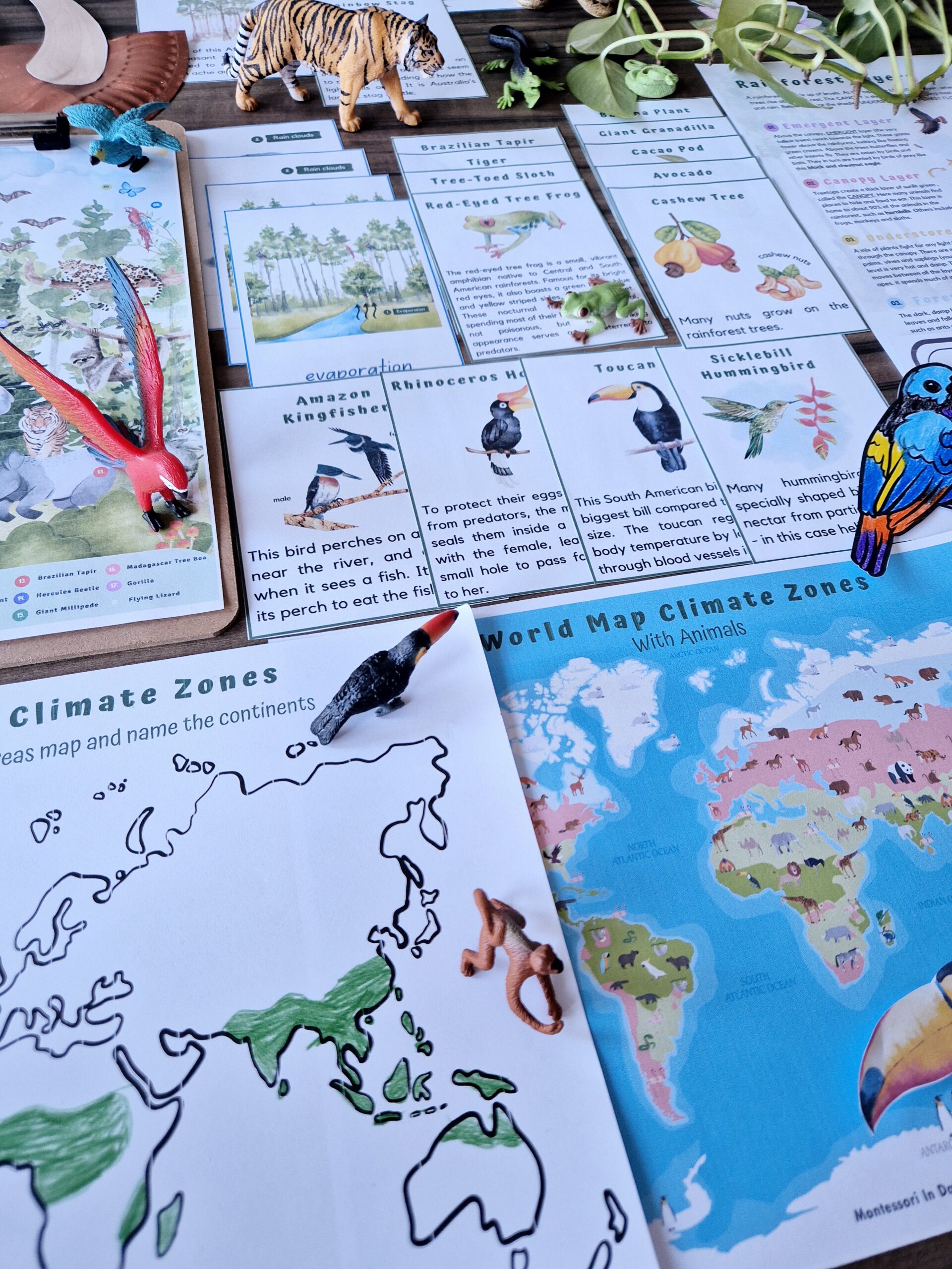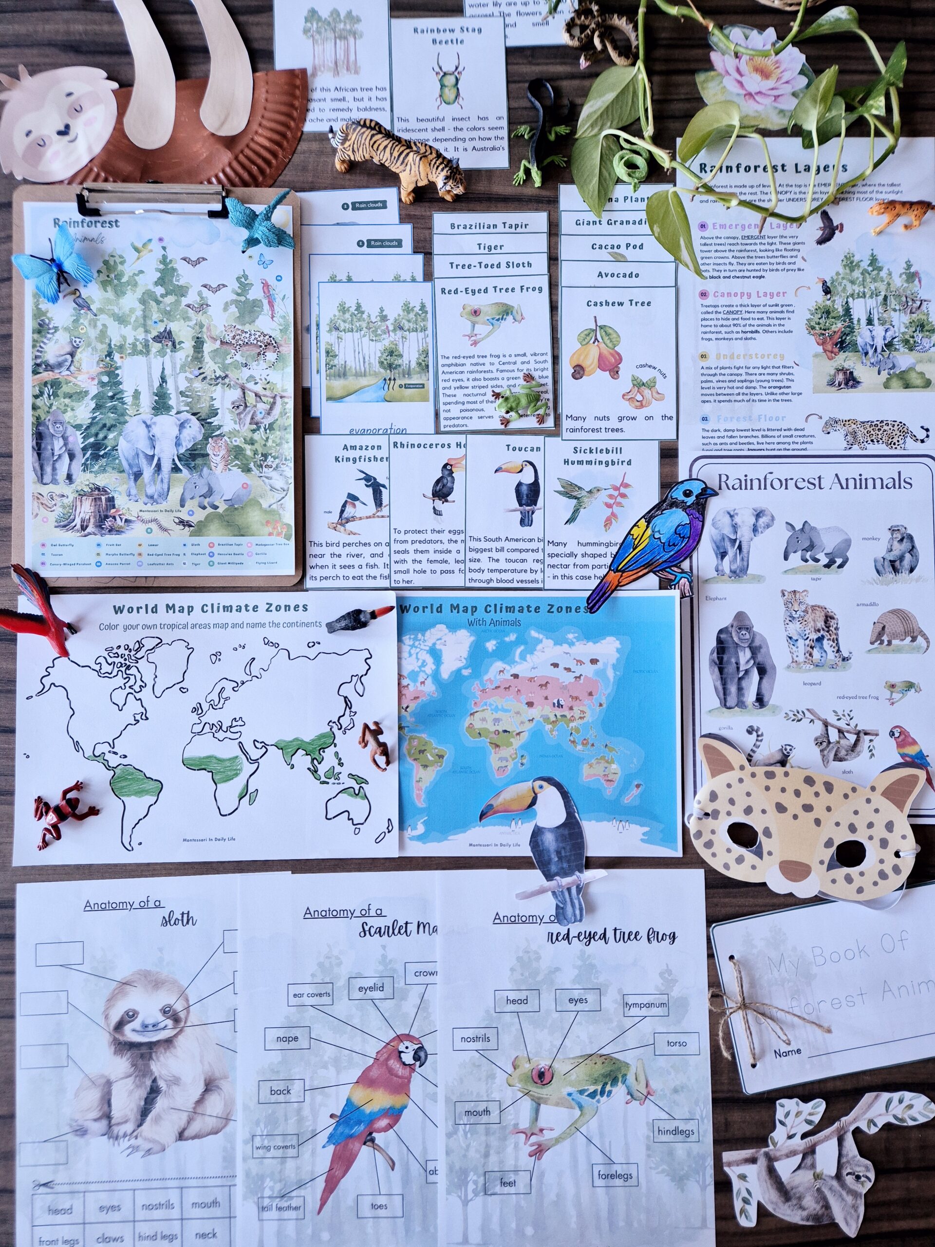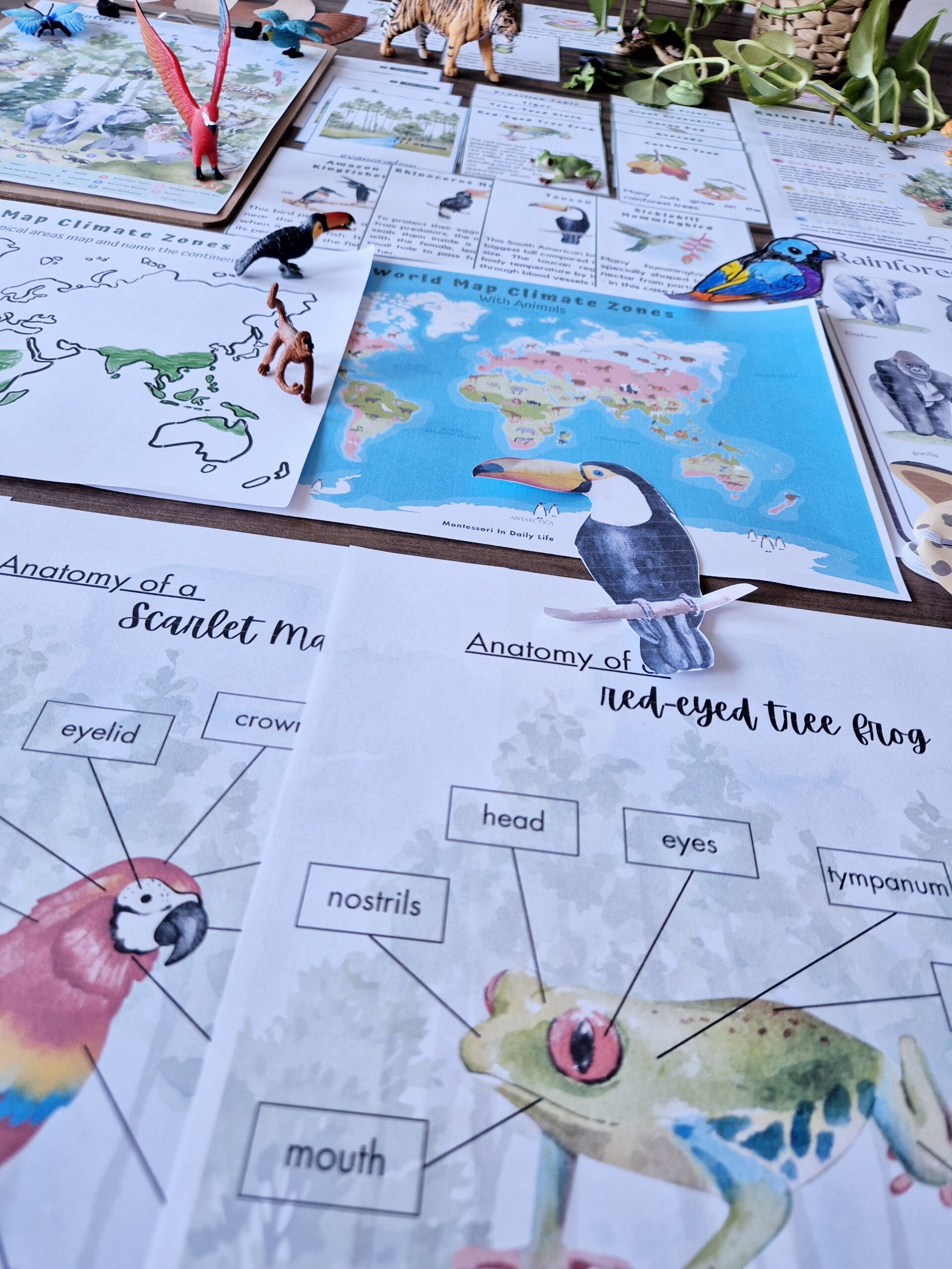 Find out about layers of the rainforest, take a walk through some truly special forest habitats and meet the animals that call it home. The unit is packed with amazing information, infographics, anatomy posters, world map climate zones, experiments, facts, games, fun crafts, math and language work, which includes to make your own Montessori book. Plus it comes with a wall-sized poster which provides a fun guide to the layers of the forest, type of animals living on each layer, their names, and a Montessori inspired removable stickers landscape poster.